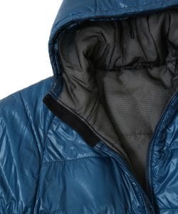 SIX MONTH NIGHTをアップデートし、軽いうえに防風性も優秀なDUTCHWARE社の極薄 10デニールナイロンARGON67を外装に。そして中綿は革新的断熱材CLIMASHIELD APEXを封入。ライナーにもUL素材のメッシュを配し、通気性の向上まで図っている。